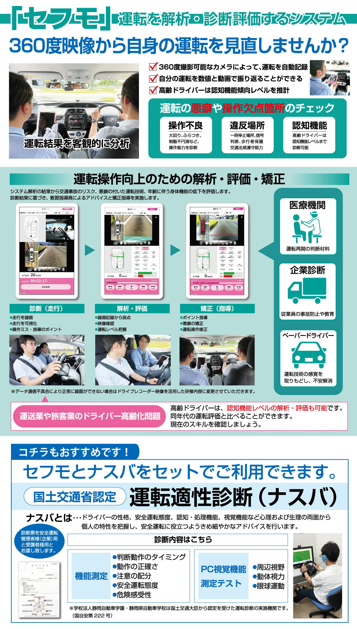 30分 | 場内走行 | [運転診断 セフモ] セフモを使用し、運転結果を客観的に分析します。運転の基本、法規履行の必要性について再認識しながら、正しい運転方法を身につけていただきます。(運転経験に応じた内容で対応いたします。) |
