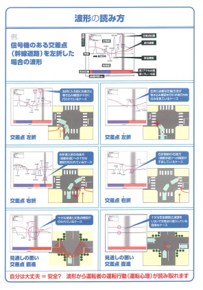 センサで計測したデータを専用ソフトで自動解析すると、安全運転に必要な運転行動がなされているか・キケンをどれだけキケンと感じられるか・身についた運転習慣やクセを見つけ出す・キケンな場所での運転行動などがわかりやすく表示されます。